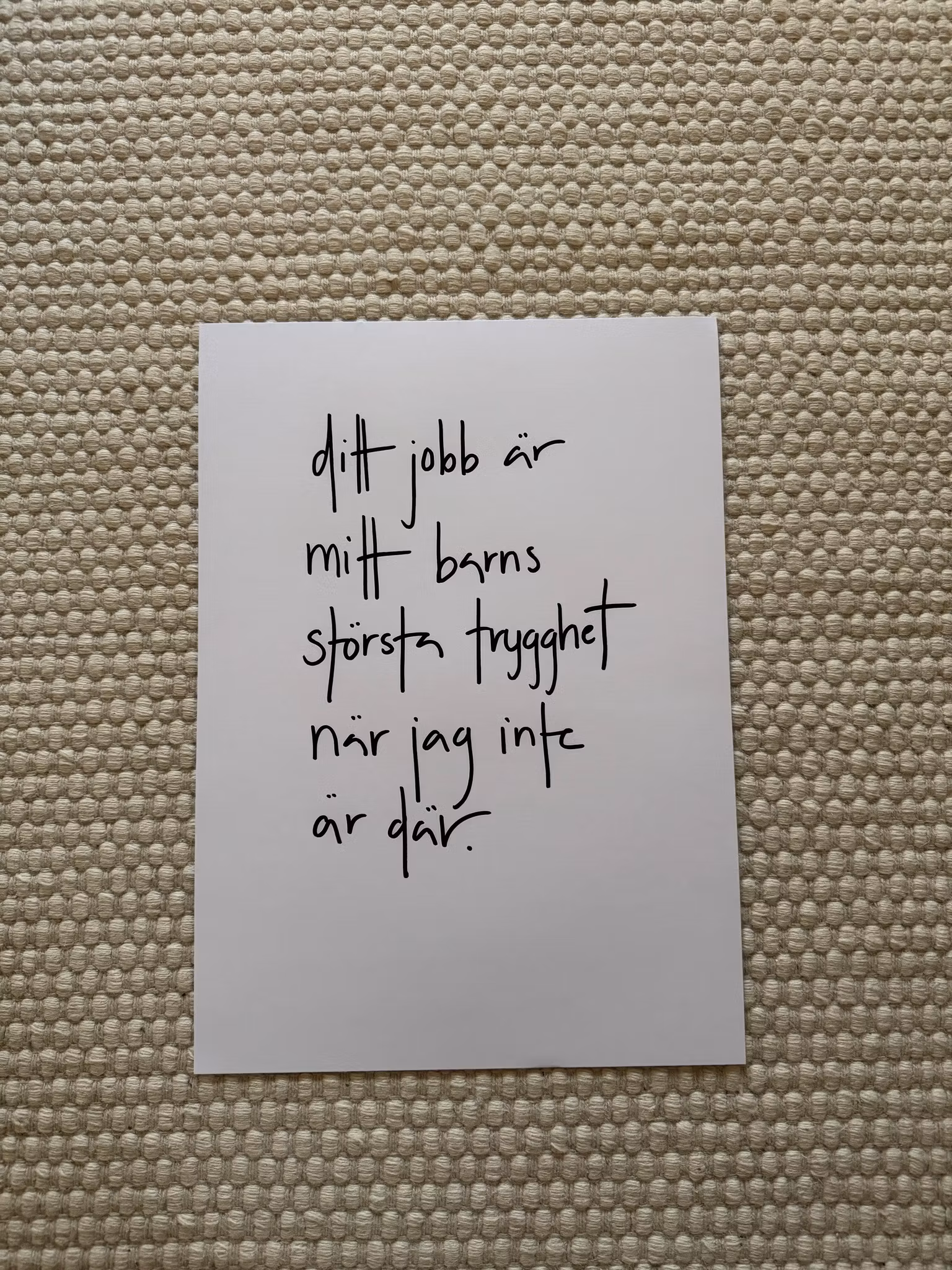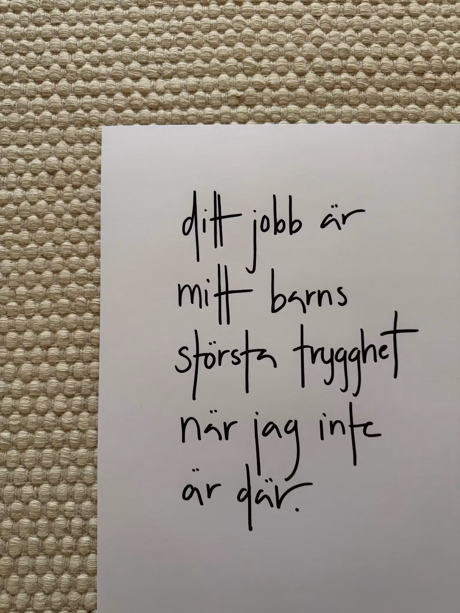 Affisch med handskriven text: "Ditt jobb är mitt barns största trygghet när jag inte är där"