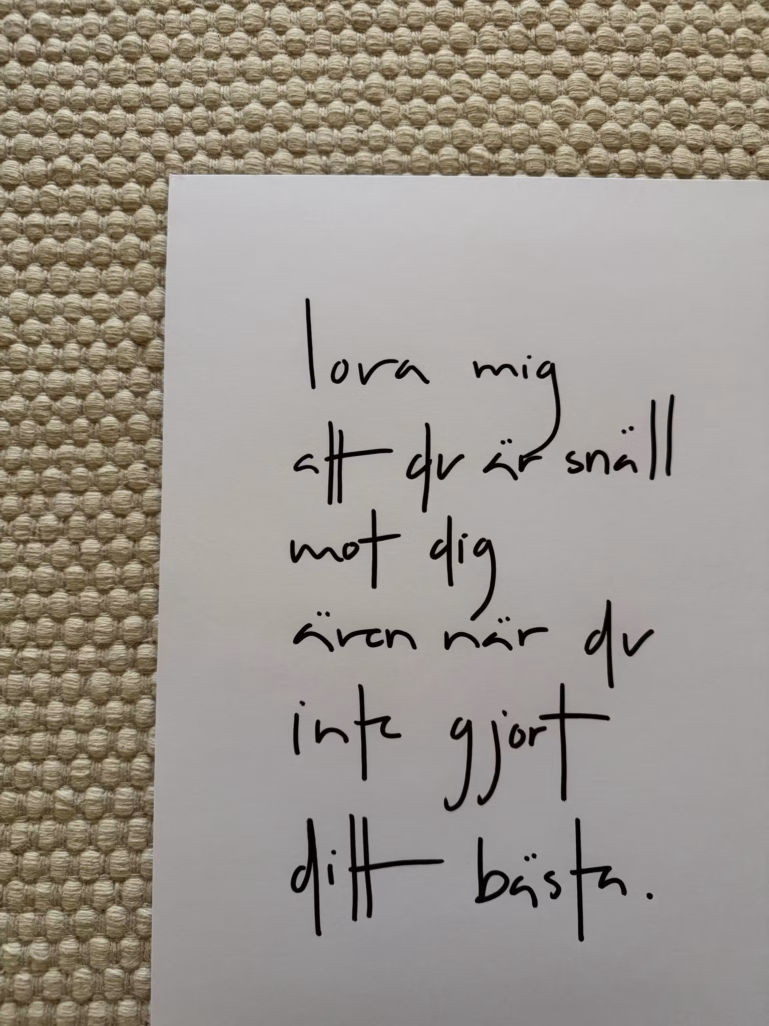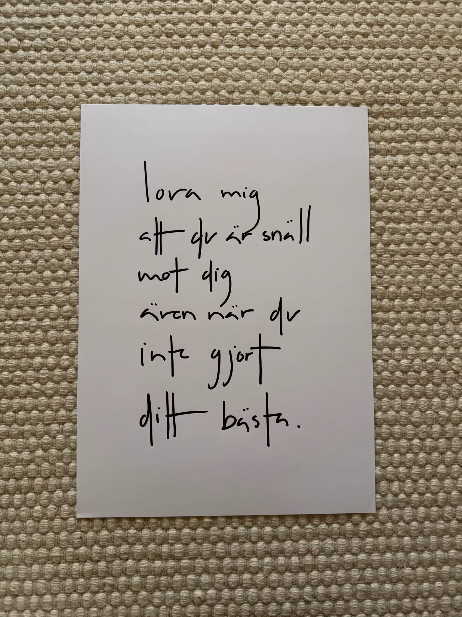 Affisch med handskriven text: "Lova mig att du är snäll mot dig även när du inte gjort ditt bästa"